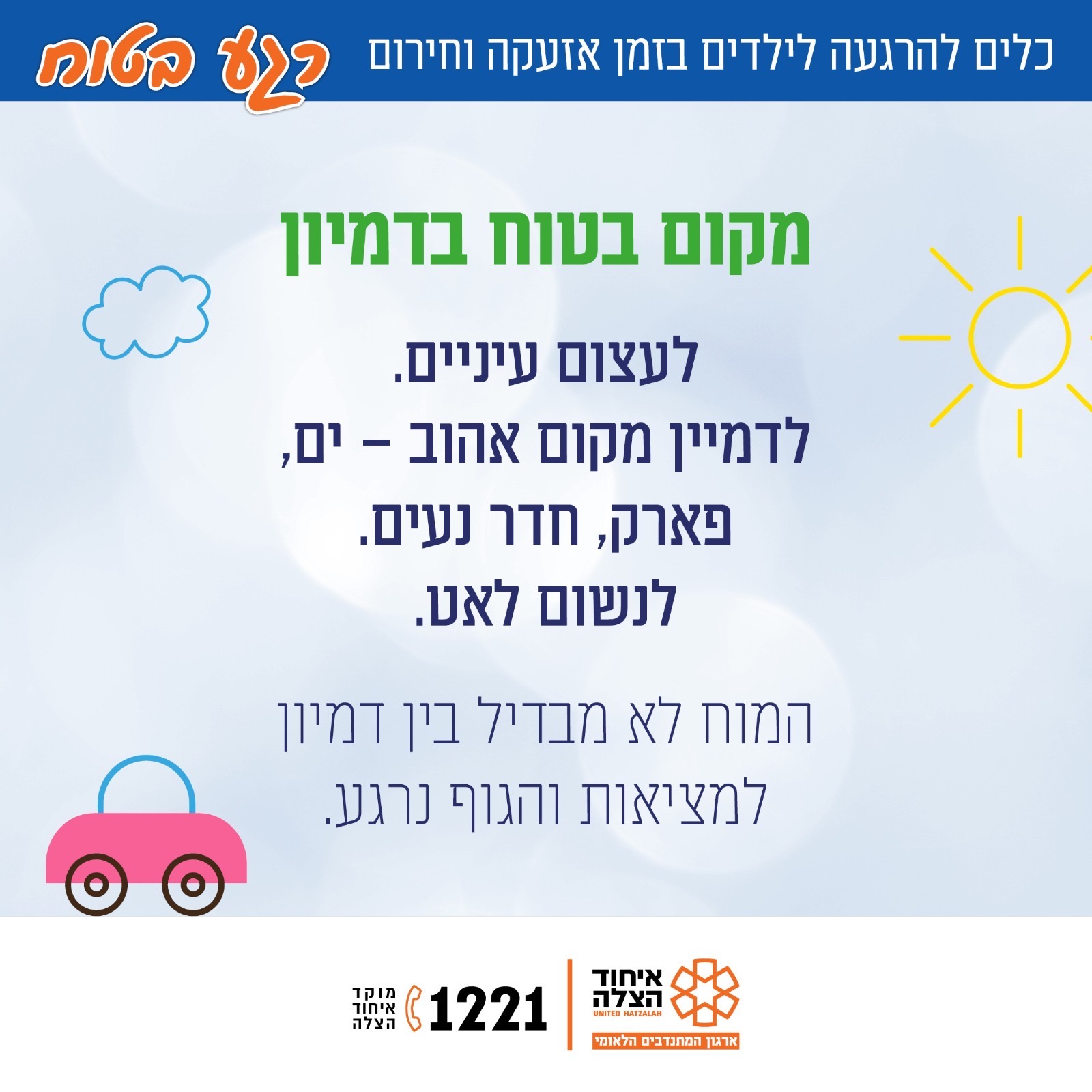 בארגון מדגישים כי האזהרה היא סימן לפעולה – לא לסכנה מיידית, וכי הליכה מהירה למקום מוגן יחד, תוך שידור מסר של שליטה וביטחון, מפחיתה משמעותית את רמת החרדה אצל ילדים.