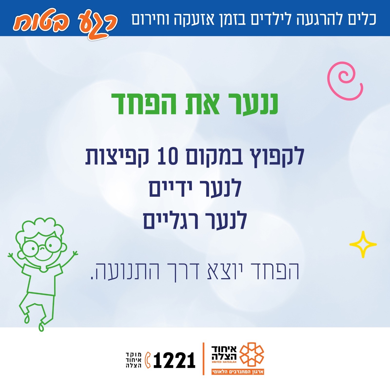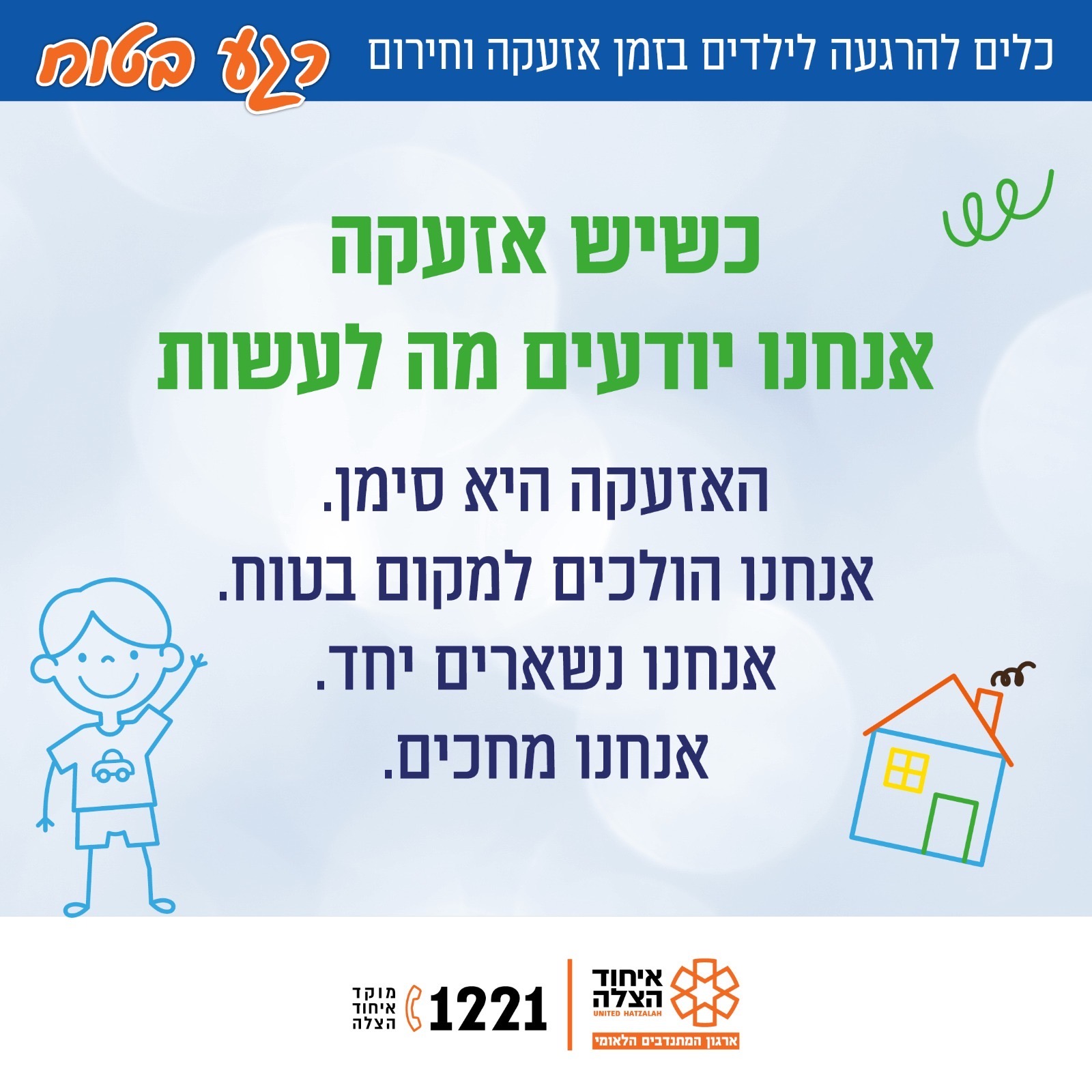 בצל ההסלמה הביטחונית והאזעקות החוזרות, בארגון איחוד הצלה משיקים מדריך מיוחד להורים: “חוסן לילדים בזמן אזעקה וחירום” – סדרת שמונה תמונות ברורות ומאוירות, שמעניקות כלים פרקטיים להתמודדות נכונה עם ילדים ברגעי לחץ.