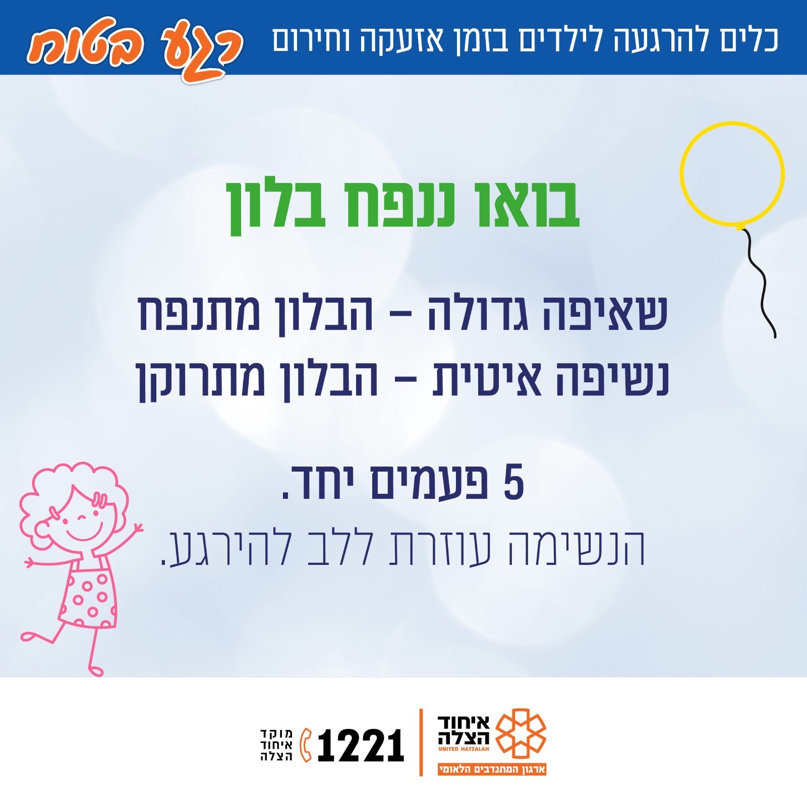 בלון בלון – נשימה עמוקה דרך האף כאילו מנפחים בלון גדול, נשיפה איטית דרך הפה. חמש פעמים יחד.