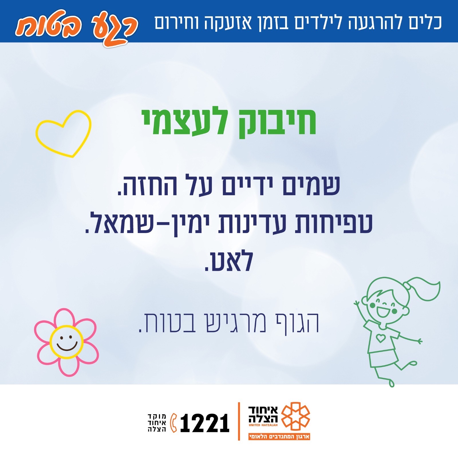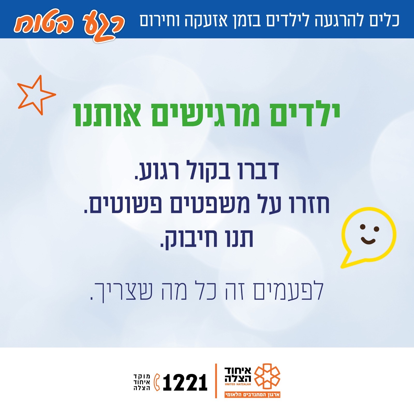 מה עושים כשנשמעת אזעקה? איך מדברים עם הילדים על הפחד? ואיך שומרים על רוגע בתוך דקות של מתח? באיחוד הצלה מפרסמים מדריך מצולם ב־8 תמונות עם כלים פשוטים וברורים להורים – לשמירה על ביטחון, חוסן ושלווה גם בזמן חירום